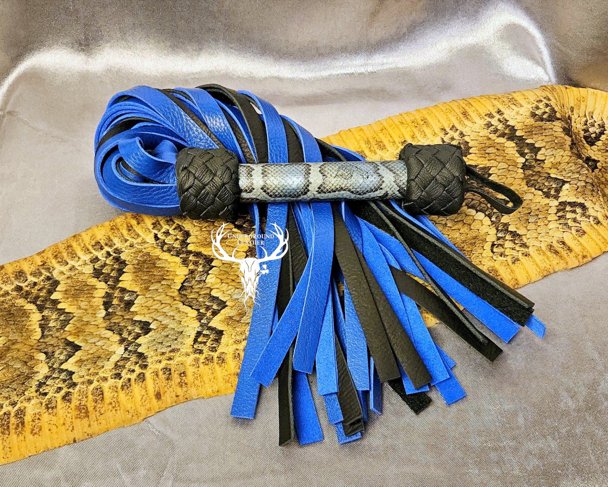This flogger features a beautiful blue and black whipsnake handle. The handle is counter- balanced and hand stitched, and has been sealed with an matte acrylic coating.