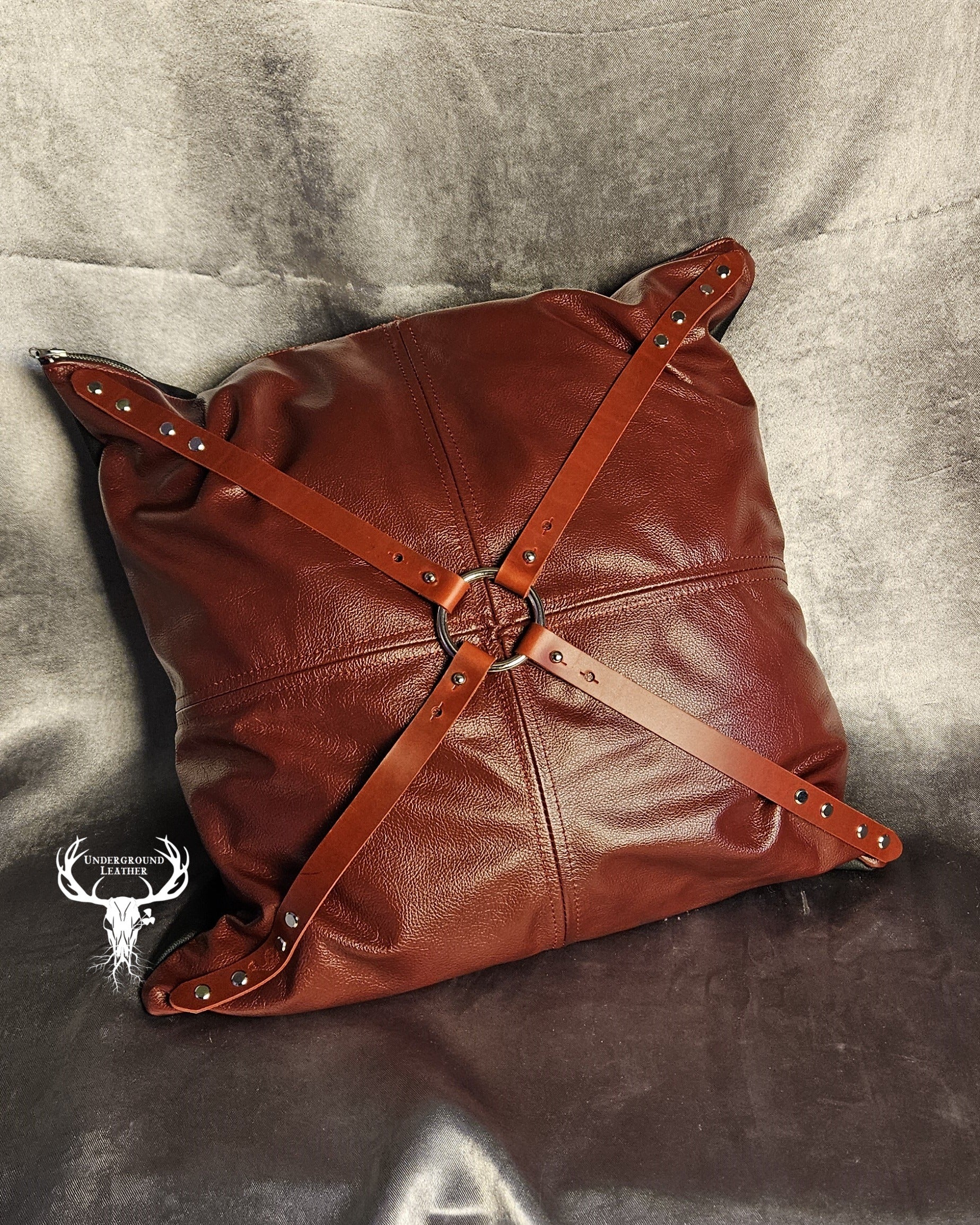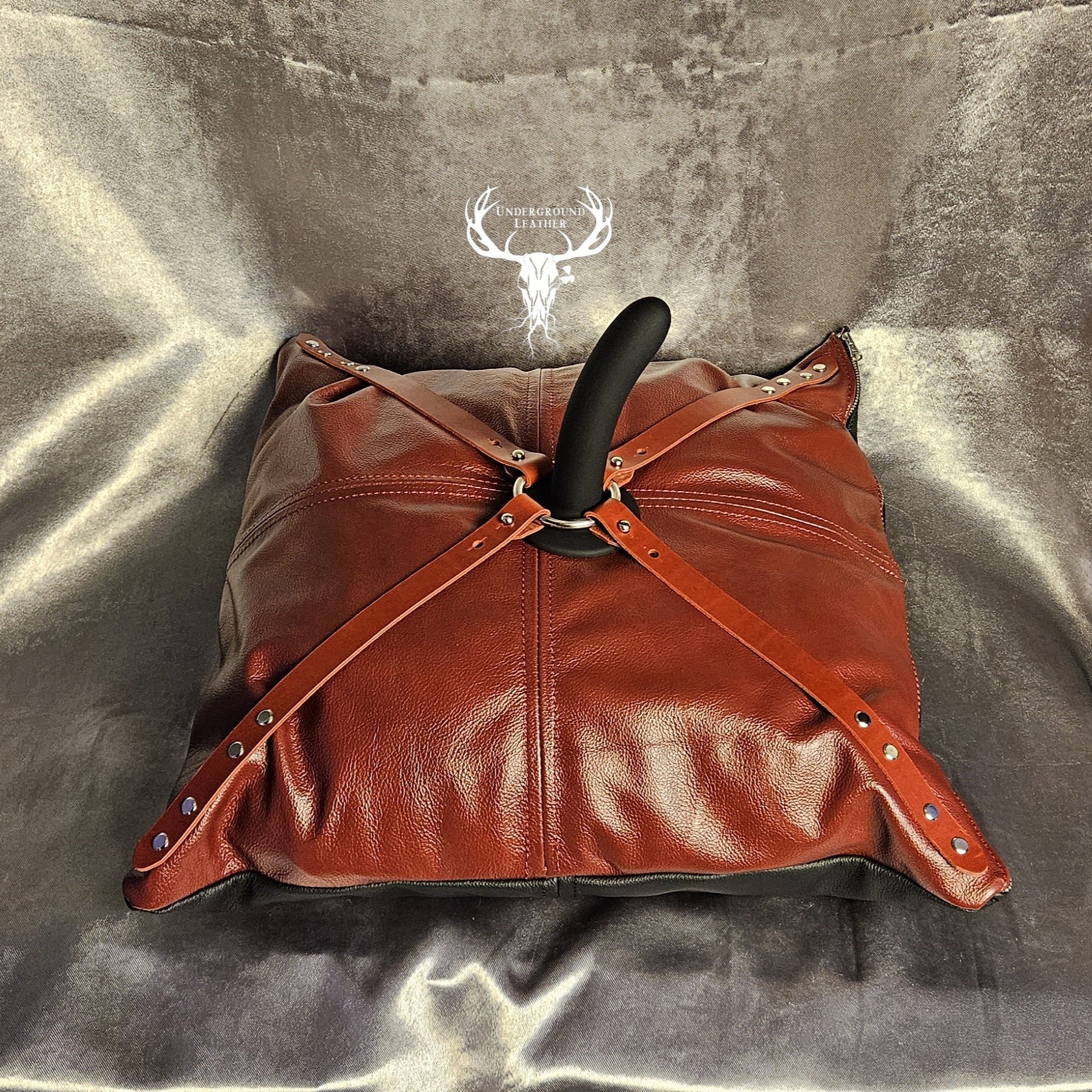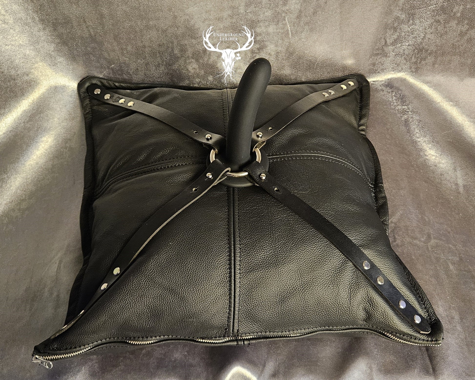 This leather pillow case (includes a pillow insert) and fits any 20x20 inch throw pillow and holds your toy steady with an adjustable and interchangeable O-ring, letting you ride and grind your way to bliss.