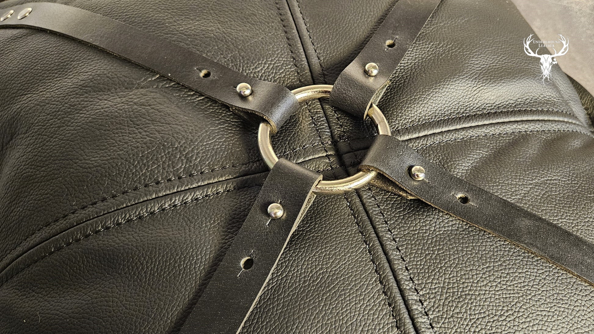 cowhide and Latigo straps. Made to order. Available in Red, black, or a mixed color scheme with Steel Hardware. 2.5 inch O-ring.