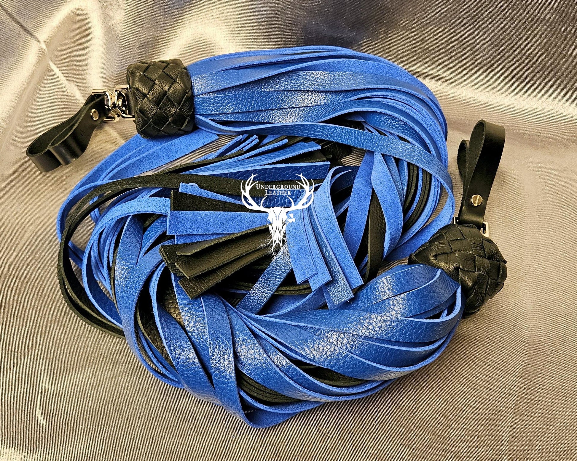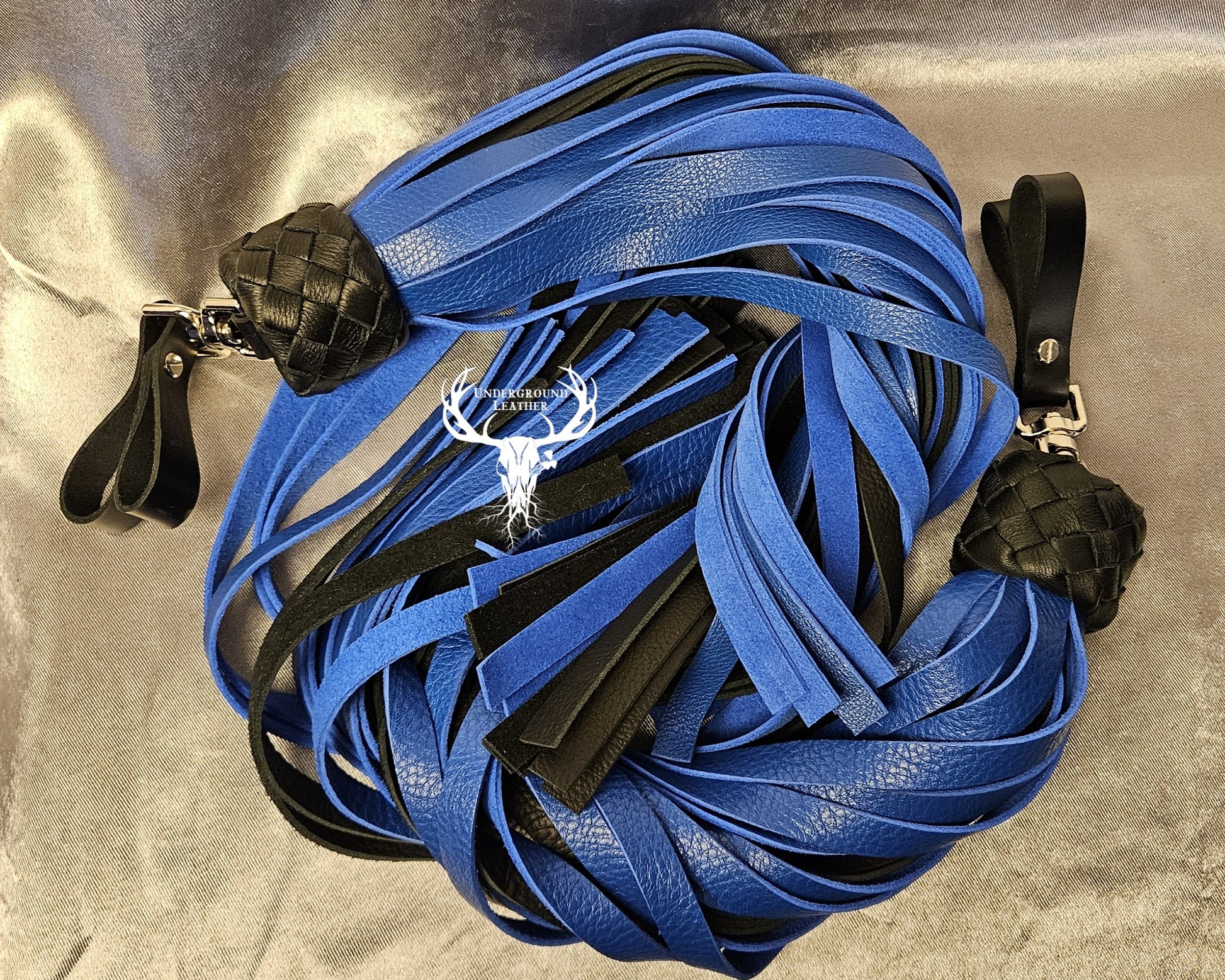 The falls of this flogger are made with a mix of hefty deep blue chrome-tanned leather and black oil tanned leather. This duo of different textures comes together to deliver sting with some weight to back it up. The swivel and finger loops are permanently affixed to negate the risk of detaching with heavy hits.