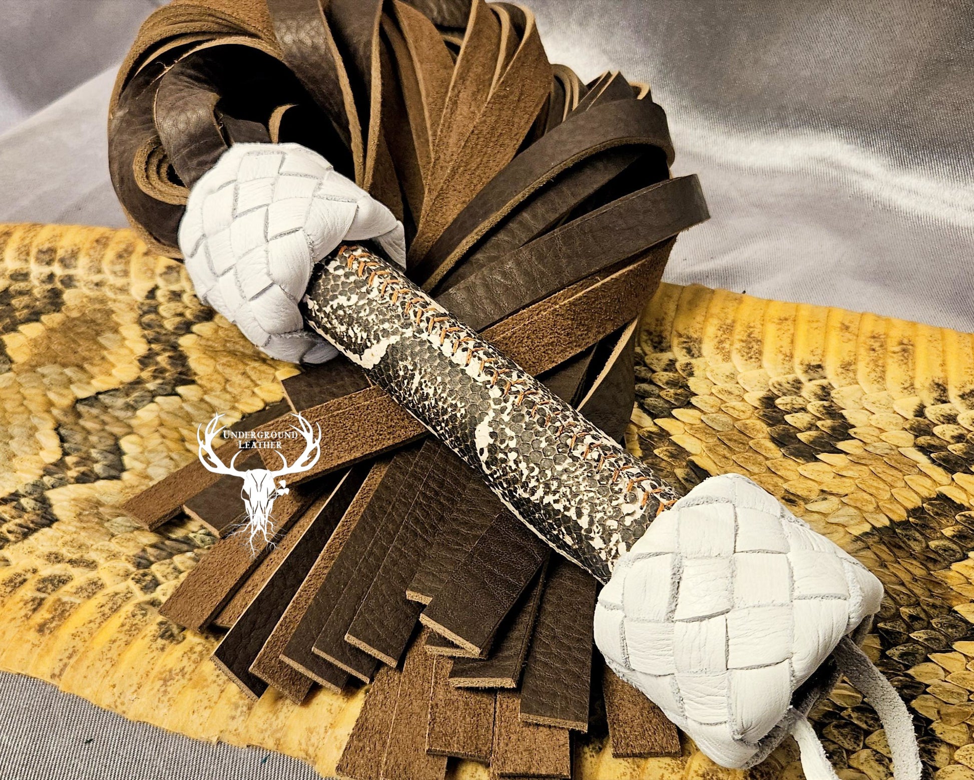 This flogger features a white and brown python handle. The handle is counter- balanced and hand stitched, and has been sealed with an matte acrylic coating.