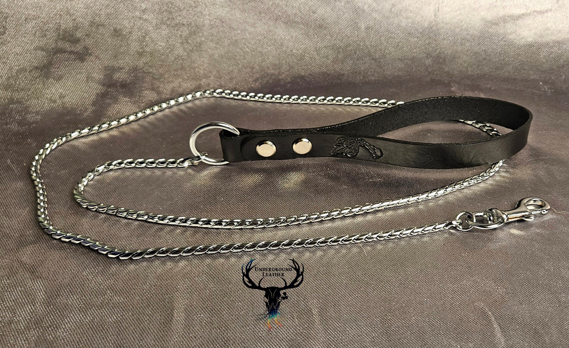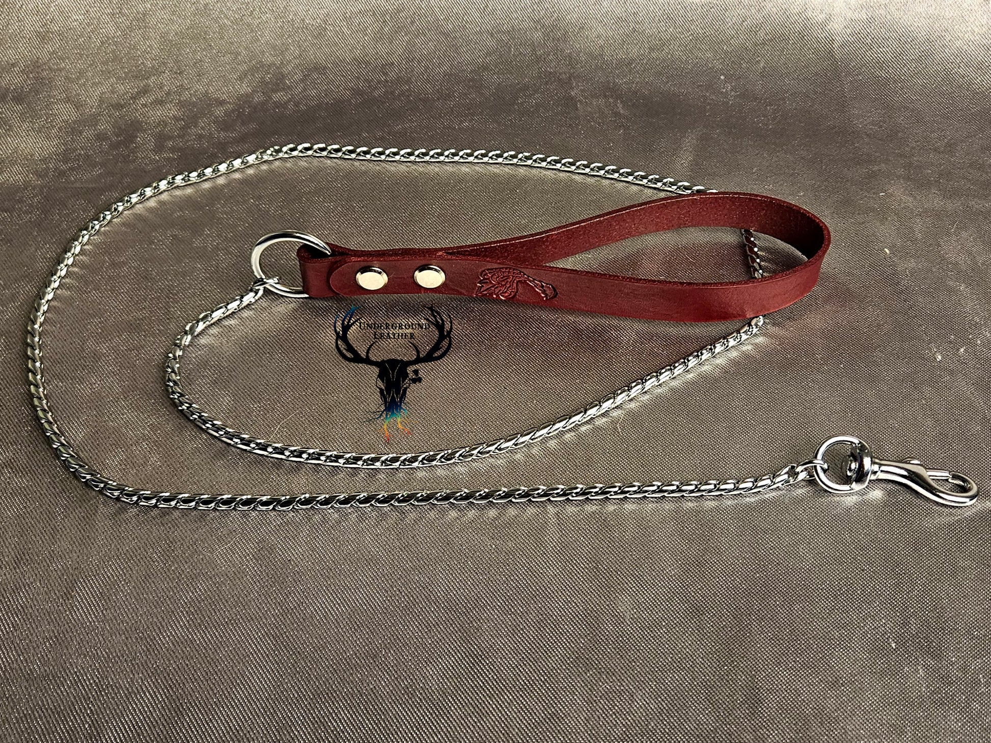 Rated to 190 lb. Made of 35in snake chain with welded end rings and hand dyed Vege-tanned leather. Available in Black, Purple, and Oxblood.