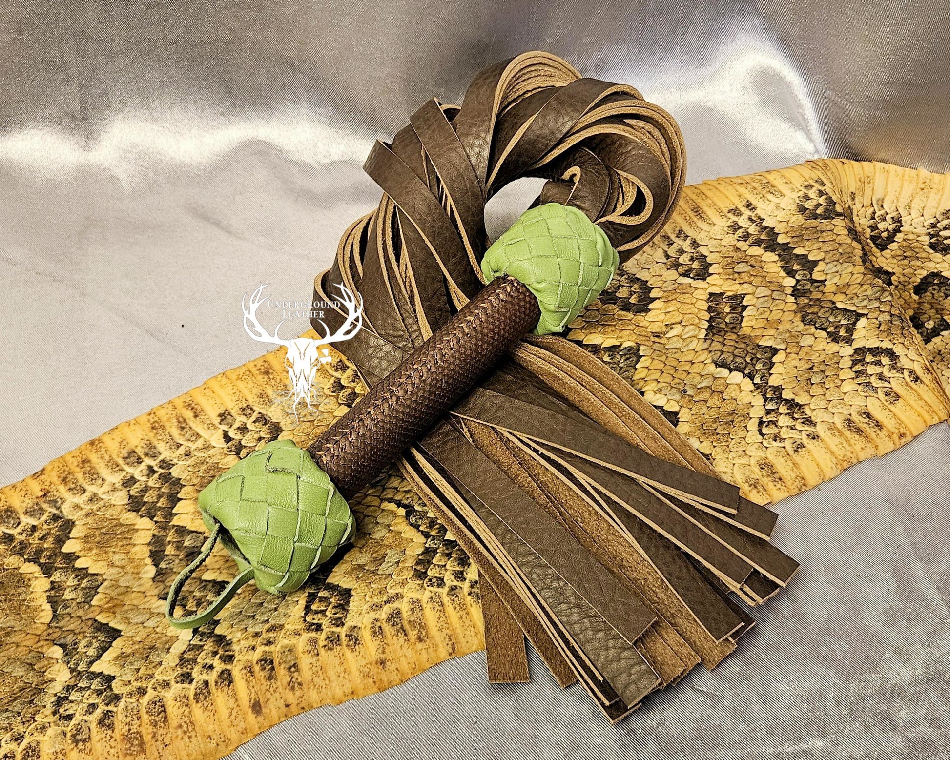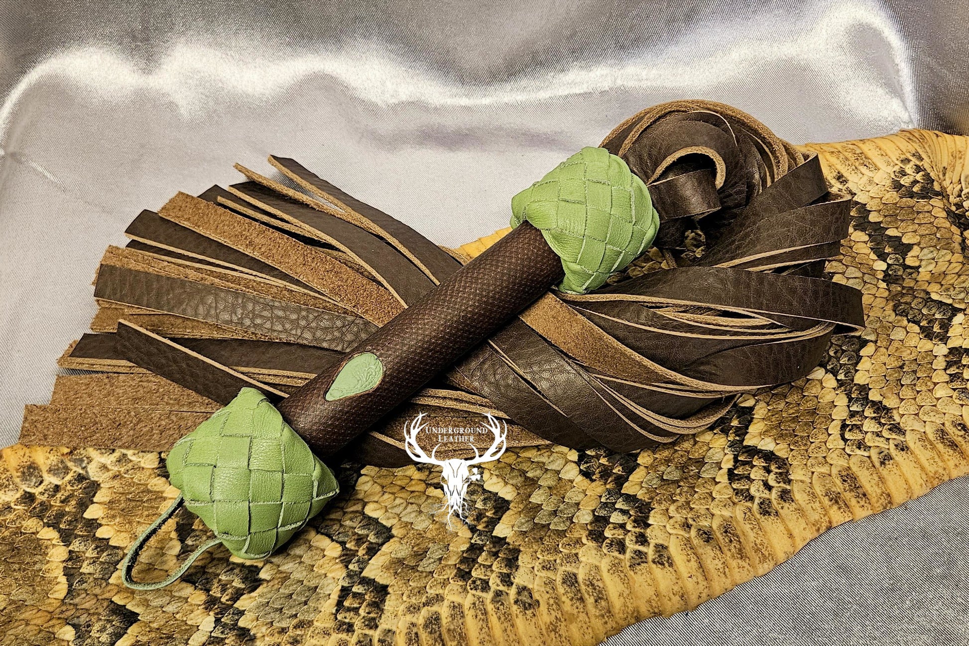 This floggers falls are made with an oil tanned, rich chocolate brown cowhide. The soft temper and weight make a beautifully thuddy flogger. They're soft to the touch, thick and cushy. The knots are braided with a green butterball leather.
