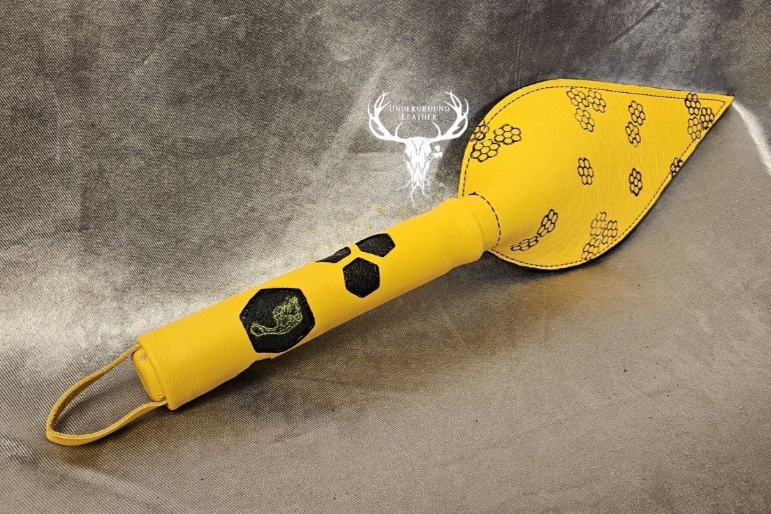 Total length of the toy is 18inches, with the tail section being 10 inches. The handle is an oak core, padded for comfort and stitched with a baseball stitch. The paddle section is 16oz (6.4mm) of stacked buffalo and yellow and black cowhide.