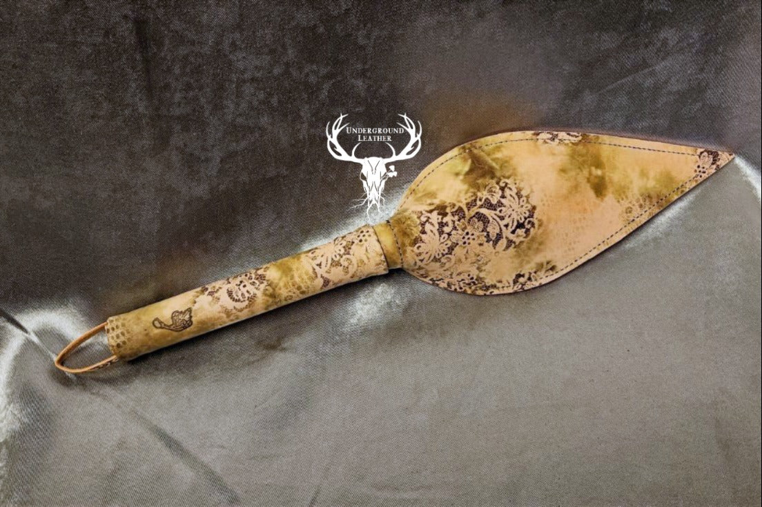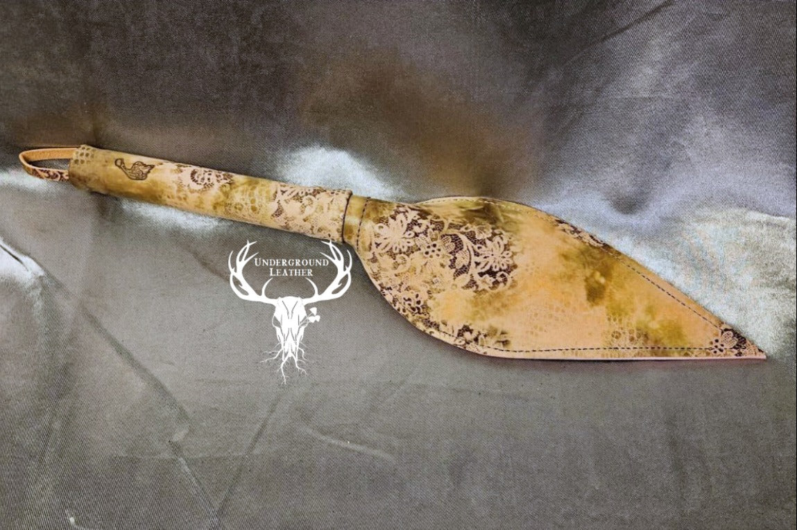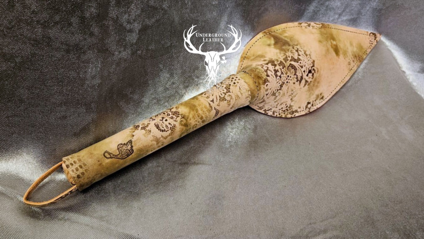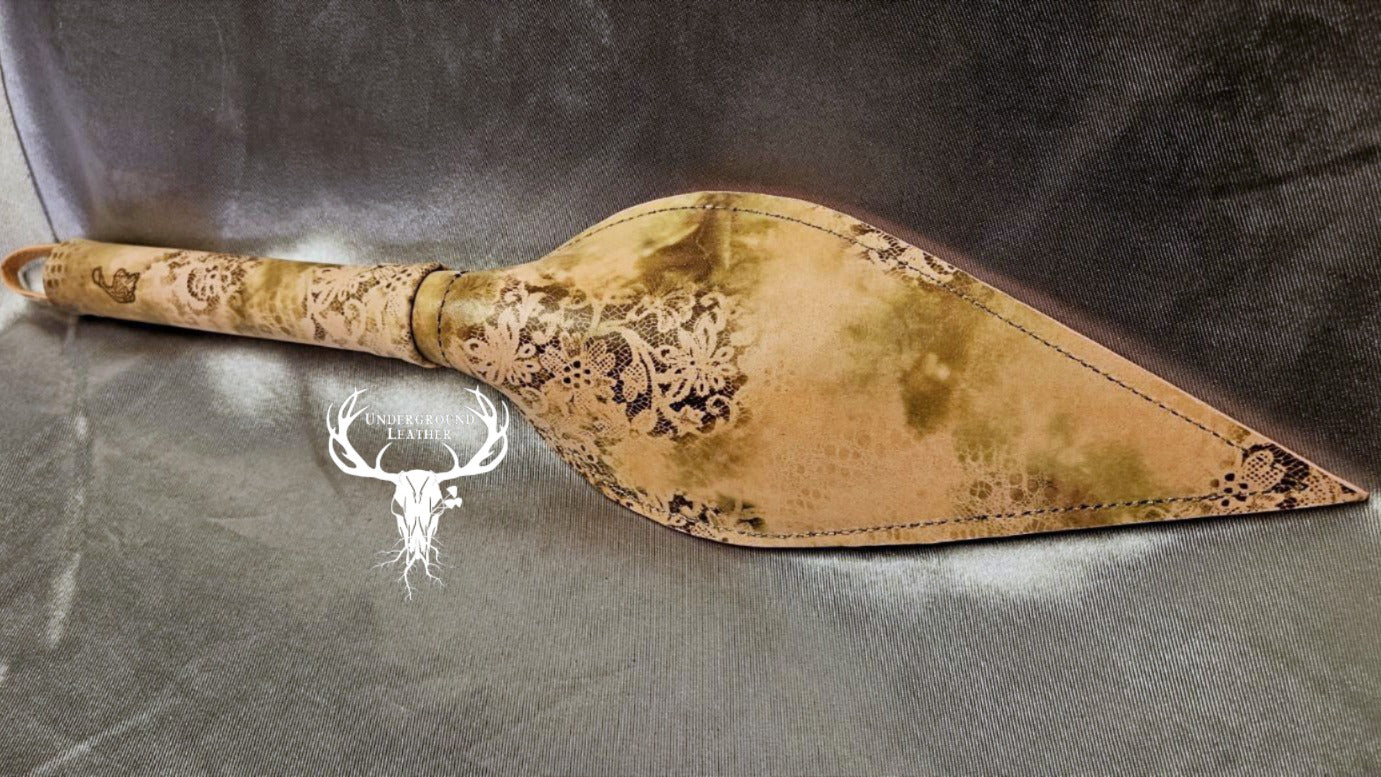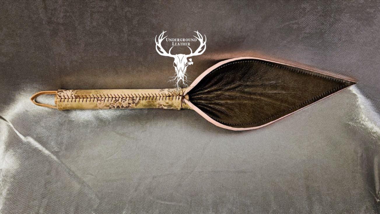 Total length of the toy is 18inches, with the tail section being 10 inches. The handle is an oak core, padded for comfort and stitched with a baseball stitch. The paddle section is 16oz (6.4mm) of stacked buffalo and lambskin hide.