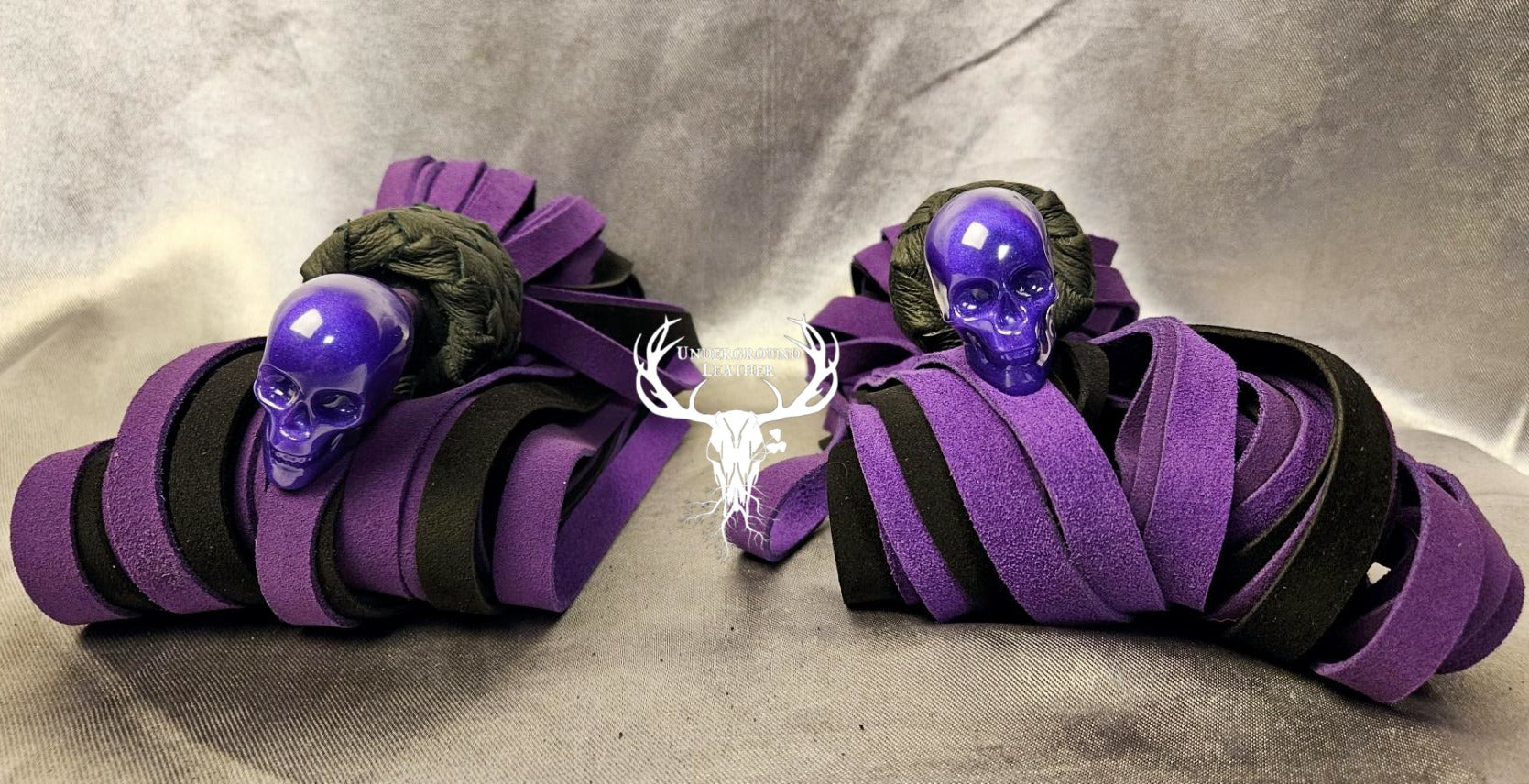 The falls of this flogger are made with a beautiful mix of purple and black suede cowhides. Suede is a type of hide that has been split from the grain of a thicker piece of leather. What is left is a soft, velvet-like leather that is fuzzy on both sides. These floggers have more falls than my average handled floggers (45 instead of 30).