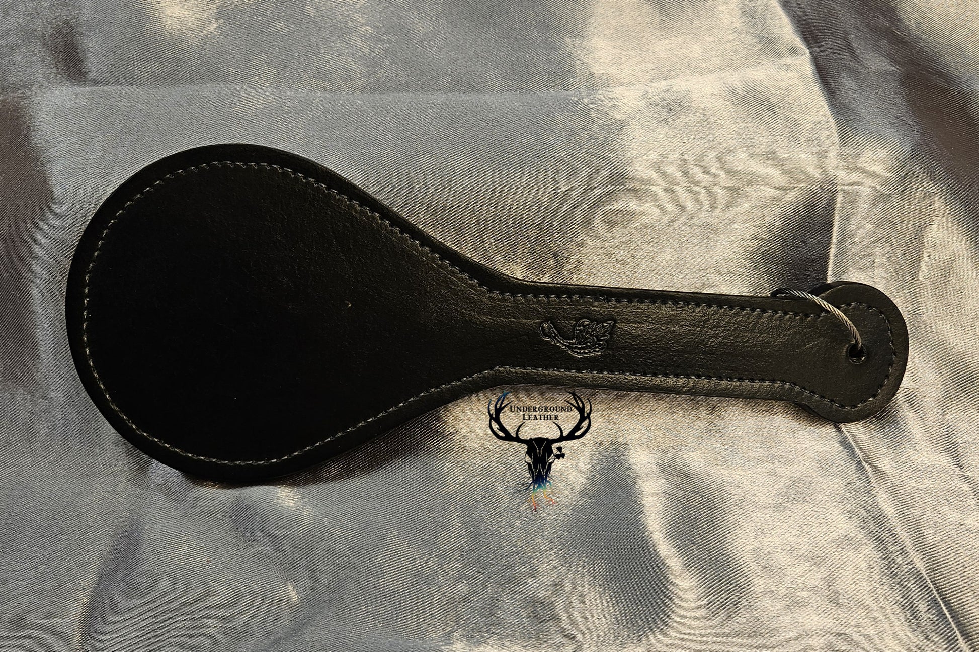 Lightweight and quick moving, these paddles pack the smack. They're 11 inches in length and just over 4 inches wide. Made of 1cm of stacked vegetable tanned leather and hand dyed, with a steel core running through the handle.
